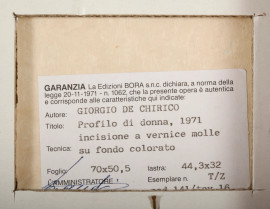 Giorgio De Chirico, Profilo di Donna, 1971, incisione a vernice molle, T/Z, cm 50x70,5, e.c.