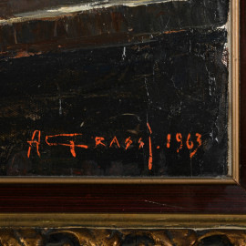 Natura silente, olio su tela, cm 80x117, firmato e datato "1963" in basso a destra, entro cornice. L'opera è corredata di certificato di autenticità rilasciato dallo Studio d'arte Tullio Grassi
