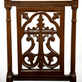 Inginocchiatoio in noce intagliato con terminale e poggiaginocchia imbottiti in velluto, XX secolo, cm 93,5x48x48