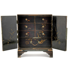 Kodansu in legno laccato nero, con ante a battente e struttura a più cassetti interni, XX secolo, cm 30x24x14