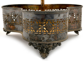 Lampada da tavolo con base traforata in metallo argentato e paralume plissettato, anni Quaranta del XX secolo, cm 43x28x28, (difetti, da revisionare)