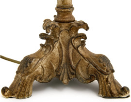 Lampada da tavolo in metallo dorato a due fuochi, XX secolo, altezza cm 76, (difetti, da revisionare)