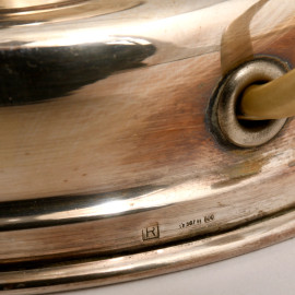 Lampada in argento 800/000 con paralume in tessuto bianco, altezza complessiva cm 68, (difetti)