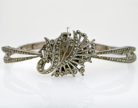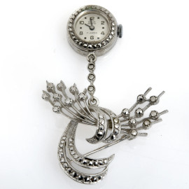 Lotto composto da 1 bracciale con orologio e una spilla con orologio in argento e strass, XX secolo, misura max cm 5,5x4