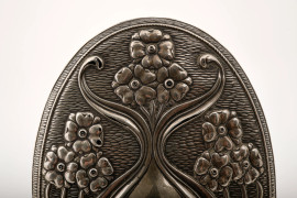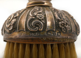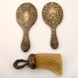 Lotto composto da 2 specchi a mano e una spazzola rivestiti in argento cesellato, XX secolo, misure massime cm 24,5x10, peso lordo totale gr. 680