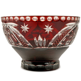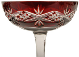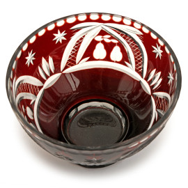 Lotto composto da 3 coppette e 4 bicchierini in vetro con decori incisi su fondo rosso, altezza max cm 10 (difetti)