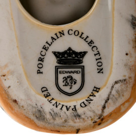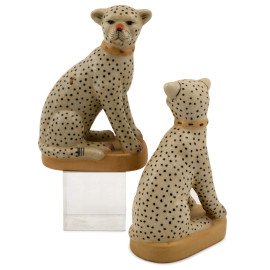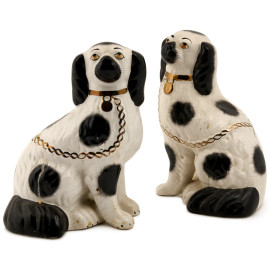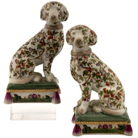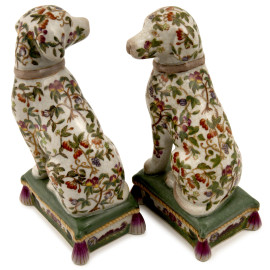 Lotto composto da due coppie di cani e da una di felini in porcellana policroma, altezza massima cm 24, (difetti)