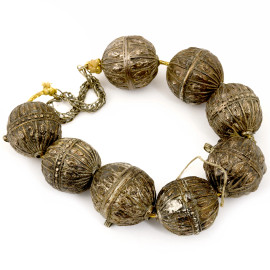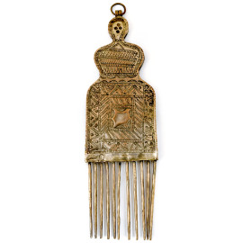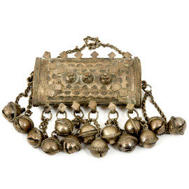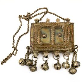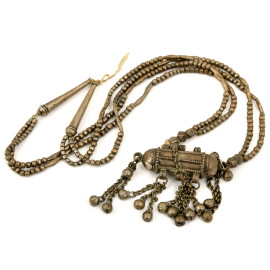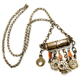 Lotto composto da quattro collane amuleto, una teiera, due pettini, un faturan in pietre dure arancioni, una collana yemenita in metallo argentato riccamente decorati a cesello con volute e motivi geometrici, XX secolo, misura massima cm 25x17