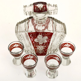 Lotto composto da una bottiglia e 4 bicchierini da liquore in vetro con decori a tralci d'uva su fondo rosso, altezza max cm 20 (difetti e sbeccature)
