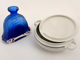 Lotto composto da una zuppiera in porcellana bianca e blu, Richard Ginori, e da una bottiglia in vetro nel toni del blu, misura max cm 15,5x30,5 (difetti)