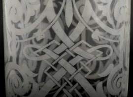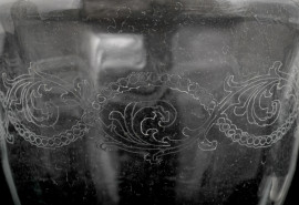 Lotto di 3 bottiglie e una caraffa in vetro con decorazioni a rilievo incise e molate, altezza massima cm 32 (difetti)