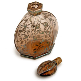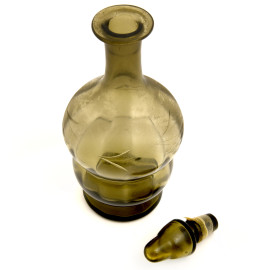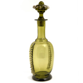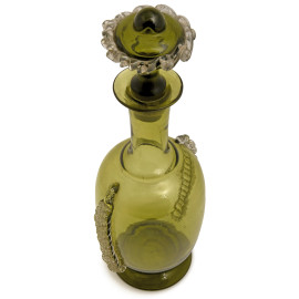 Lotto di 3 bottiglie in vetro e cristallo nei toni del verde e del rosso con decori a rilievo incisi e molati, altezza massima cm 33 (difetti)