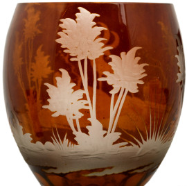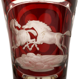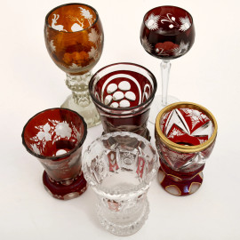 Lotto di 6 bicchieri in vetro e cristallo di fogge diverse nei toni del rosso e dell'arancio, altezza max cm 20,5 (difetti)