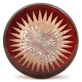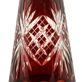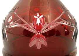 Lotto di due bottiglie in cristallo nei toni del rubino con decori incisi e molati, altezza max cm 24,5 (difetti, prive di tappo)