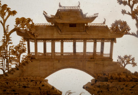 Lotto di due diorama cinesi in sughero entro teche in legno laccato nero, misura max cm 20x20 (difetti)