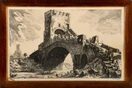 Lotto di due riproduzioni di incisioni di Giovanni Battista Piranesi (1720-1778), cm 37xx58 entro cornice, (difetti, gore e tracce di umidità)
