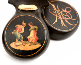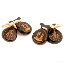 1) coppia di nacchere in legno con figure tradizionali dipinte e sigla al retro; 2) coppia di nacchere in metallo dorato