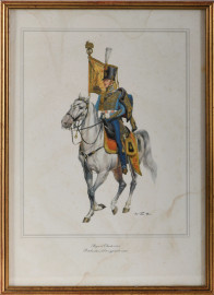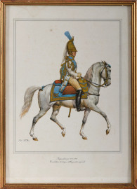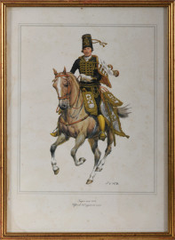 Lotto di quattro stampe raffiguranti soldati di cavalleria, XX secolo, cm 34x24,5, entro cornice, (difetti)