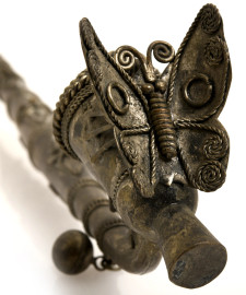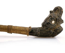 Lotto di tre pipe di ispirazione mediorientale realizzate in legno e metalli, XX secolo, cm 32, (difetti, rotture e mancanze)