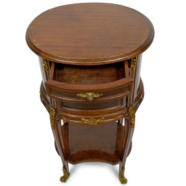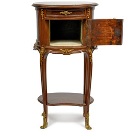 Il fronte curvilineo ospita un piccolo cassetto superiore e uno sportello centrale bombato, entrambi impreziositi da applicazioni in metallo dorato finemente cesellato. Montanti scanalati terminano in piedi decorati con piedi leonini in bronzo dorato.