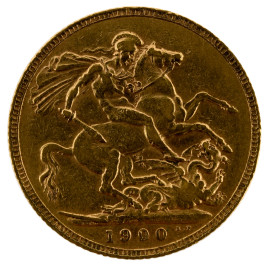 Moneta del 1900 in oro raffigurante la regina Vittoria e San Giorgio che uccide il Drago al retro, diametro 20 mm, peso gr 7,98
