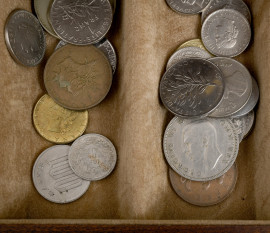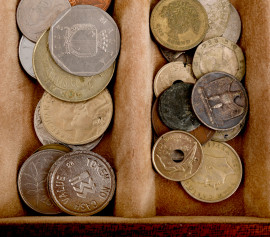 Monetiere in legno con quattro cassetti contenenti monete di diverso genere e provenienza, cm 17x34x22, (difetti)