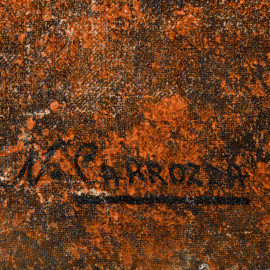 Nicolò Carrozza, Battimento di Marfisia e Bradamante, olio su tela, cm 50x75, firmato in basso a sinistra, retro titolato e datato "5.4.1969"
