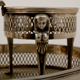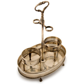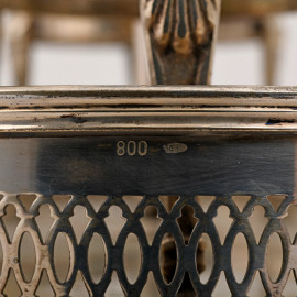 Oliera da tavola in argento traforato e cesellato, con base poggiante su quattro piedini, XX secolo, cm 28,5x21,5x15, gr. 630