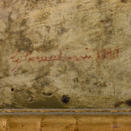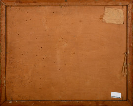 Paesaggio con fiume e ponte, olio su compensato, cm 54,5x71,5 entro cornice, seconda metà del XX secolo, firmato in basso a sinistra