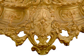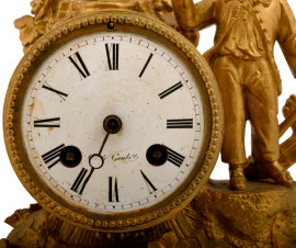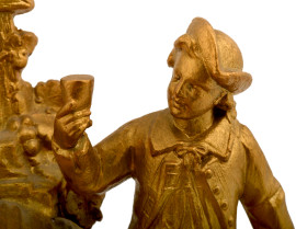 Pendola da tavolo in antimonio dorato con quadrante circolare e decori con figura maschile in atteggiamento conviviale, base in legno laccato, XX secolo, cm 32x34x18, (difetti, meccanismo da revisionare)