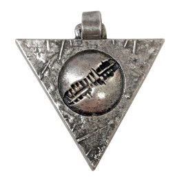 Arnaldo Pomodoro pendente scultura con sfera inserita in un triangolo, metallo argentato, cm 4x4 circa, firmato