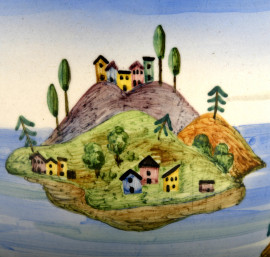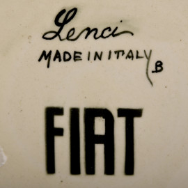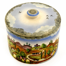 Produzione Lenci per Fiat Torino, anni Cinquanta, Portabonbon in ceramica policroma con coperchio, marchio alla base, cm 12x15, (difetti)