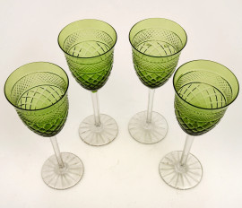 Quattro calici in vetro molato e inciso nei toni del verde, altezza cm 17,5 (difetti)