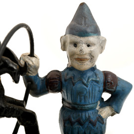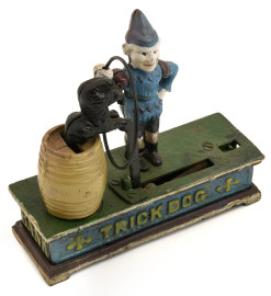 Salvadanaio Trick Dog in ghisa con movimento meccanico. Stati Uniti, XX secolo, cm 17x19x7, (difetti)
