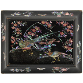 Scatola decorata con ricca composizione policroma raffigurante due uccelli tra rami fioriti di ciliegio, realizzati con inserti in materiali iridescenti. Interno privo di suddivisioni.