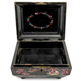 Scatola orientale in lacca nera con intarsi, XX secolo, (difetti), cm 16x27x20, (difetti)