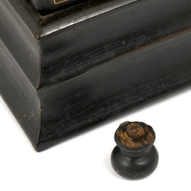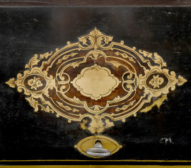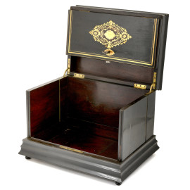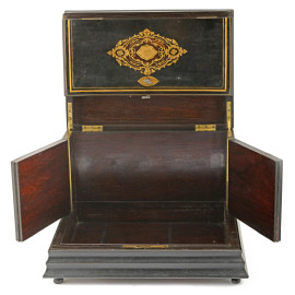 Scatola portaliquori Napoleone III in legno ebanizzato, con intarsi dorati e a finta tartaruga, filetti in ottone, cm 26,5x36,5x26,5, (difetti)