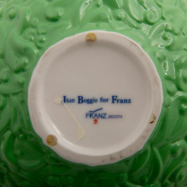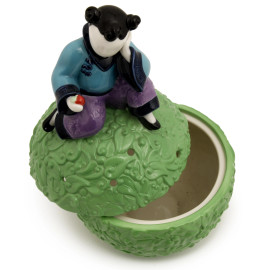Scatola sferica in porcellana policroma sormontata da figura orientale, Jean Boggio for France, altezza cm 26, diametro cm 16,5, (difetti)