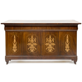 Mobile scrittoio con fronte a nove cassetti, tre superiori e sei laterali disposti in colonne. Piano di lavoro arricchito da cornice intarsiata a motivi fitomorfi e floreali che corrono anche sul fronte dei cassetti e arricchiscono i lati. Piedi a sciabola