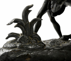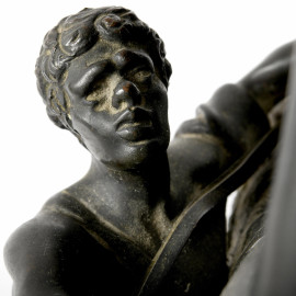 Scultura in bronzo raffigurante dioscuro con cavalllo imbizzarrito, cm 40x35x15,