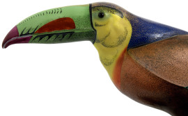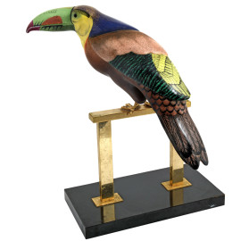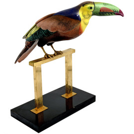Scultura in metallo smaltato raffigurante Tucano, seconda metà del XX secolo, cm 47x40x37, (difetti)