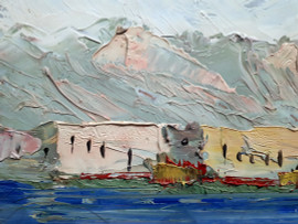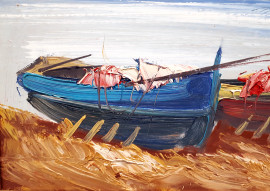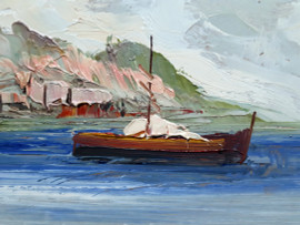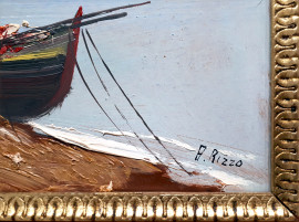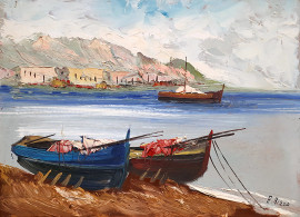 Scuola Napoletana del XX sec., veduta costiera con barche, olio su faesite, cm 30x40, formato, con cornice