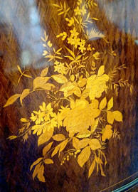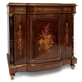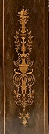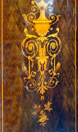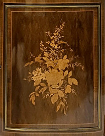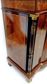 Il fronte è articolato in tre pannelli decorativi, con anta centrale convessa e due laterali piene arricchite da raffinato ornato floreale. Ai lati, due colonnine tornite scanalate con capitelli e basi in bronzo sorreggono visivamente la struttura.