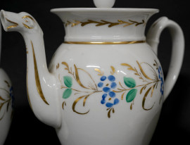 Servizio da caffè in porcellana con decori a motivi floreali nei toni nel blu, verde e oro, XX secolo, (difetti)