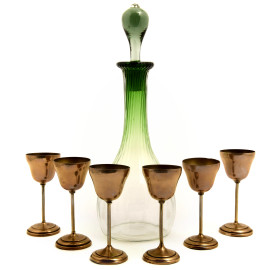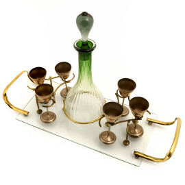 Servizio da liquore con bottiglia in vetro soffiato e sei bicchierini in metallo argentato su vassoio in vetro, cm 24x17x7, (difetti)
