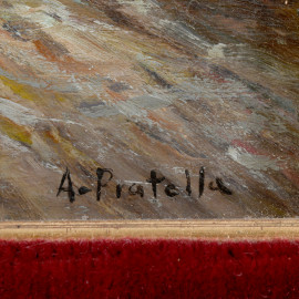 Strada con figure e carrozza, olio su tavoletta, cm 12,5x20 entro cornice, firmato in basso a destra A. Pratella, (difetti)