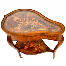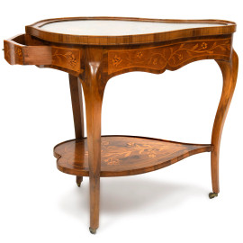 Tavolino da salotto di forma asimmetrica dotato di due ripiani decorati, il superiore con vetro e l'inferiore a giorno. Gambe arcuate. Un cassetto al lato.