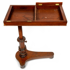 Tavolo da colazione regolabile in mogano, con piano bipartito su fusto tornito poggiante su base a rotelle, cm 73,5x75x41,5, XX secolo, (difetti)