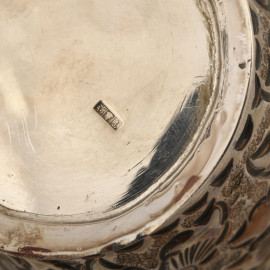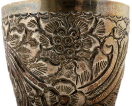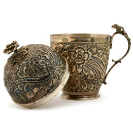 Tazza con coperchio in argento con decori floreali a sbalzo, presa a foggia di fiore, peso gr 290, altezza cm 15,5,