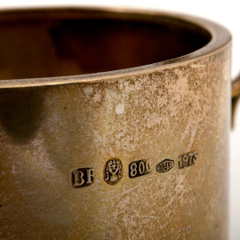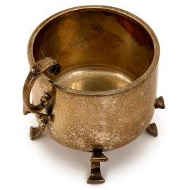 Tazza in argento con manico a volute, poggiante su quattro piedini, altezza cm 11, diametro cm 9, gr. 230